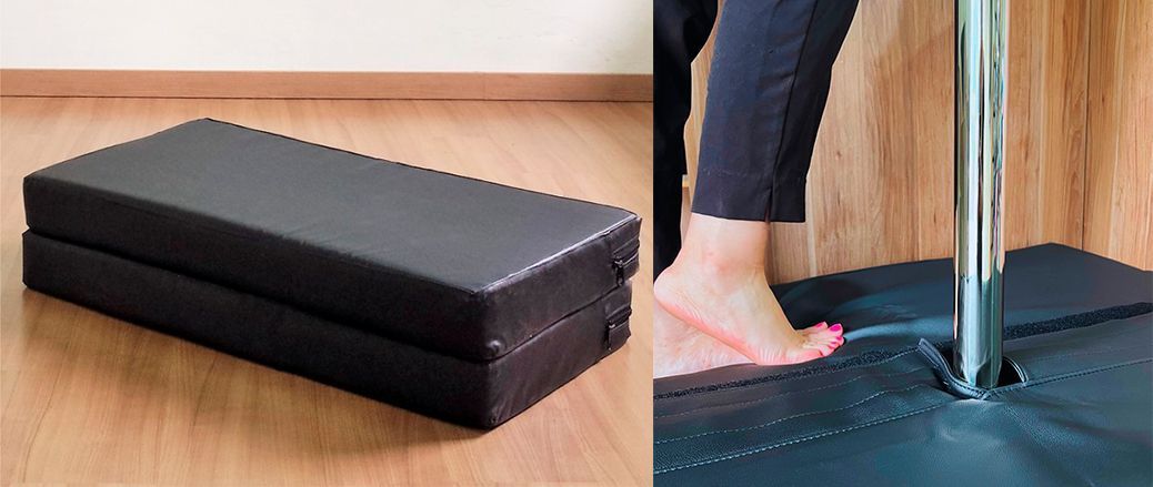 When assembled around the pole, the Gaia Mattress occupies a square area of  3.28ft x  3.28ft / 1.00m x 1.00m. Perfect for any space, it’s enough to provide a safe training area. The advantage of the mat disassembling into two parts that are locked together by Velcro during use is that it’s easy to transport and store after use, even in small spaces. In addition, some studios take advantage of this versatility to leave it in the corner of the room to form a small “sofa”, as shown in the image below.