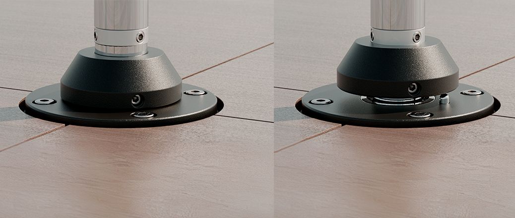 The Pole comes disassembled in 3 partss o it’s easy to transport and assemble! . And there’s a plus: you can add the Flying Pole, also 3-piece, in your purchase, and have a rubberized Pole in your stage! Both the pole and the installation kit are stored inside the base, that convertos into 2 rolling cases. When assembling the stage, the 3 parts of the pole fit together easily and a screw between them guarantees all the necessary security.